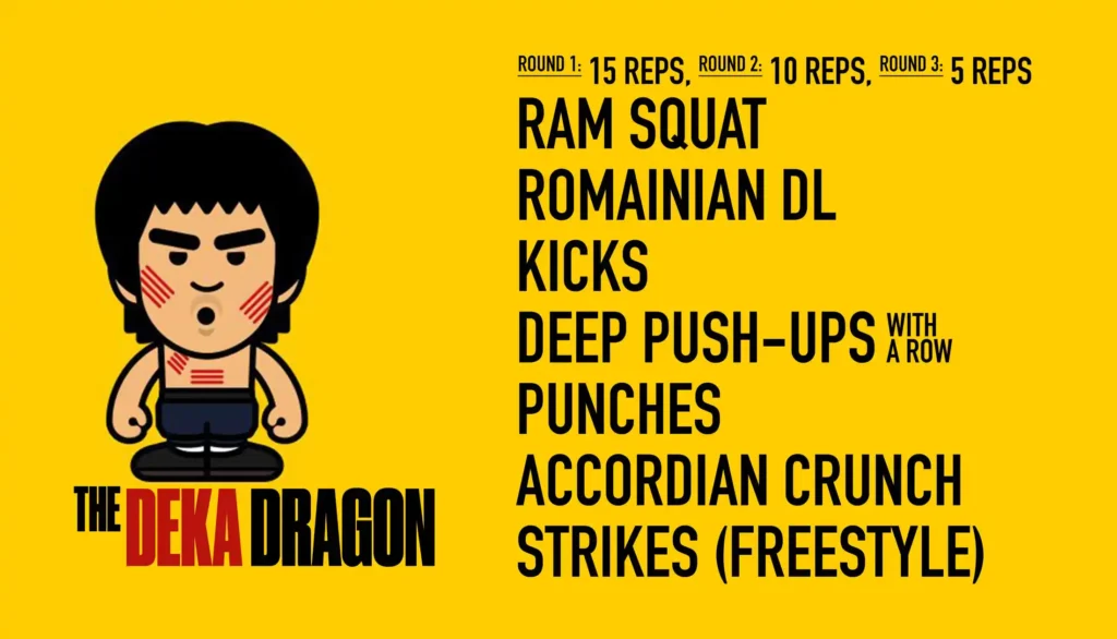This one’s a beast. Inspired by the intensity and precision of Bruce Lee, The DEKA Dragon is a tiered, descending-rep WOD that challenges strength, control, coordination, and endurance. It’s a fusion of martial arts energy, functional strength, and bodyweight movement—all packed into three rounds of progressive burn.