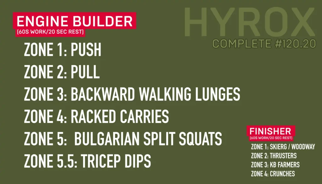 Today’s HYROX COMPLETE #120.20 session is all about building stamina while testing your strength under pressure. This workout blends muscular endurance, stability, and grit into one non-stop engine-building challenge.
