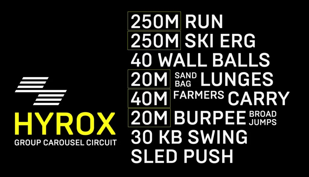 If you’re ready for a workout that keeps you moving, challenges every muscle group, and delivers serious cardio payoff, the Hyrox Group Carousel Circuit is your WOD. This one mirrors the HYROX race format more closely than most, bringing you the signature blend of endurance and strength in a fast-paced group setting.