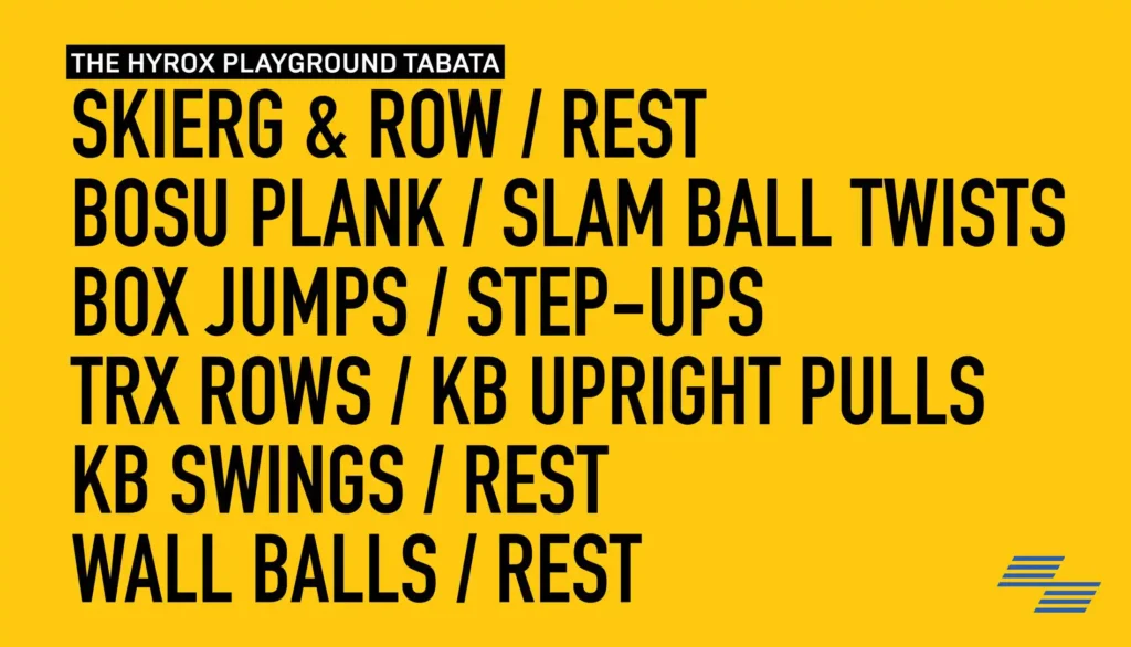 If you’ve ever wanted a workout that feels like recess for grown-ups—but with way more sweat—the Hyrox Playground TABATA is it. This WOD mixes strength, cardio, and core training into short, fiery intervals. With TABATA timing (20 seconds of work, 10 seconds of rest), every round pushes intensity without dragging on too long. It’s about explosive effort, fast recoveries, and serious results.