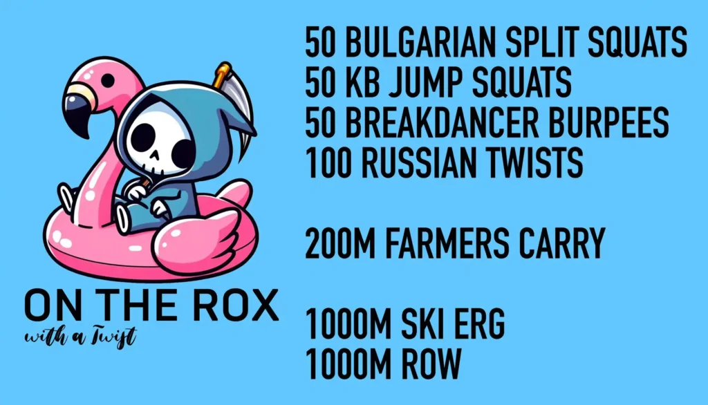 This isn’t a random collection of movements. “On the Rox with a Twist” is built to hit every major muscle group while training mental toughness. The squats build raw leg power, the burpees demand agility, the twists lock in rotational core strength, and the carry develops grip and posture. Then, when you’re fatigued, the SkiErg and Row test your ability to push through sustained cardio efforts. This is what Hyrox training is about: full-body conditioning that prepares you for both competition and real life.