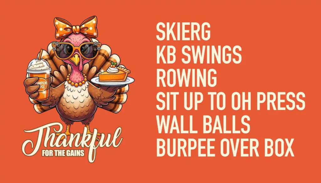 “Thankful for the Gains” is a calorie-torching, power-building WOD built around six stations that combine endurance, explosiveness, and control. Whether you’re showing up post-holiday or looking to earn your feast in advance, this workout delivers serious sweat.