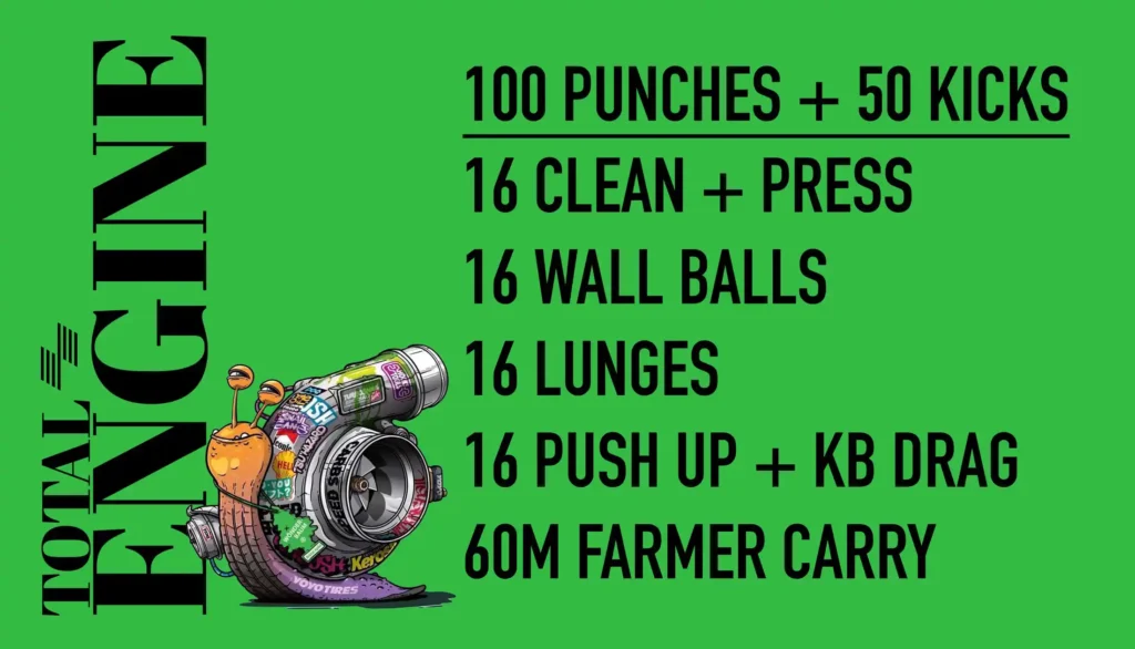 Some workouts hit a muscle group. This one builds your engine. “TOTAL ENGINE” is a raw, full-body circuit designed to keep your heart rate high, your muscles firing, and your mindset locked in. With a fusion of strikes, strength moves, and functional carries, this is the kind of WOD that builds real-world fitness.